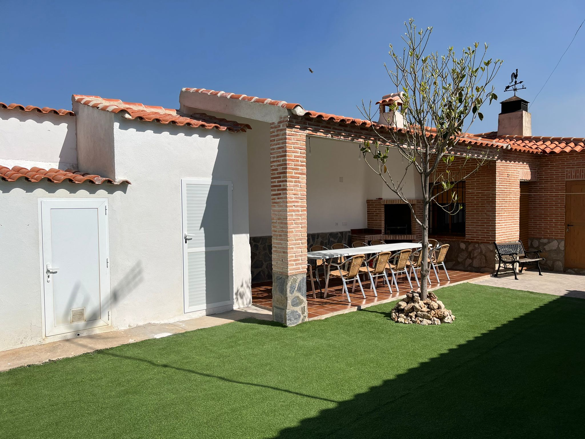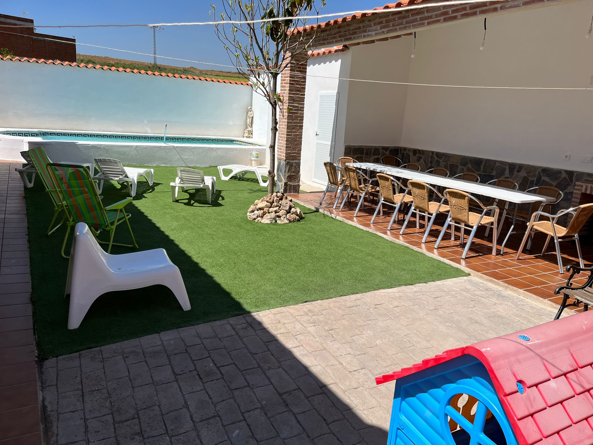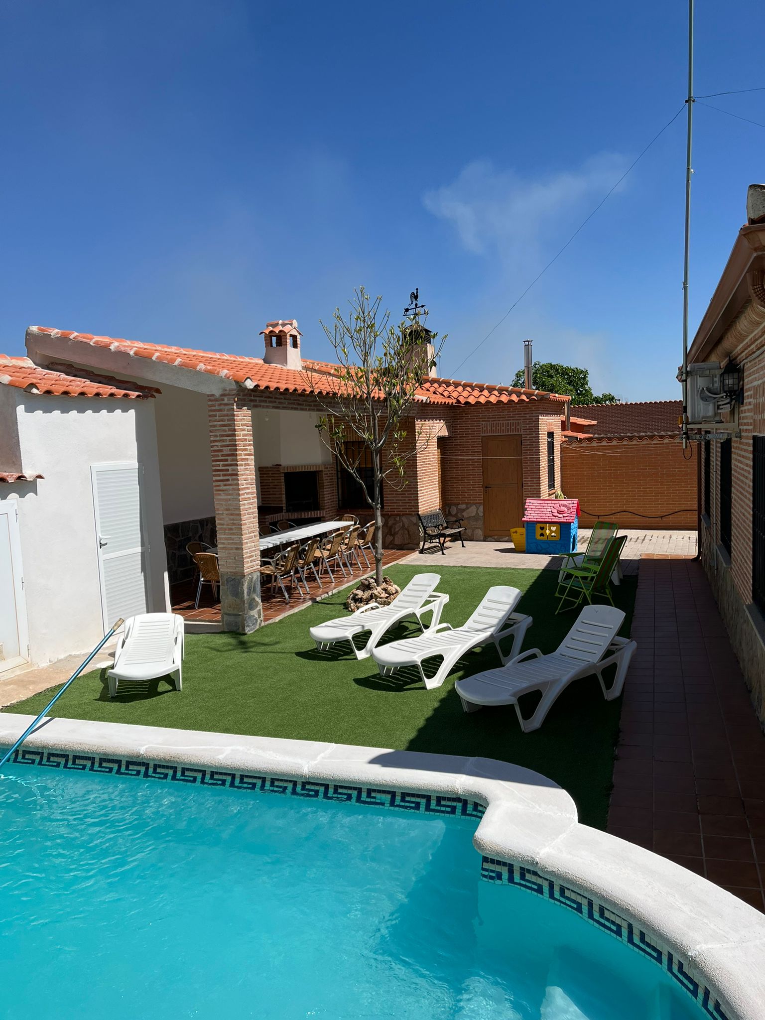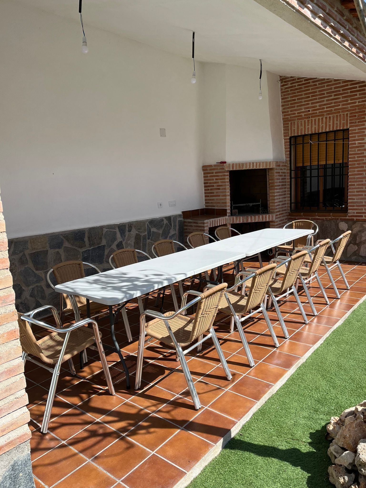 Disponemos de un gran Porche de entrada con jardín alrededor de toda la casa y mobiliario exterior, la piscina de verano con caseta independiente para depuradora, tumbonas y sombrillas además en esta zona se dispone de una segunda cocina exterior con chimenea en el patio, menaje de todo tipo incluido aro de gas y paellera grande.