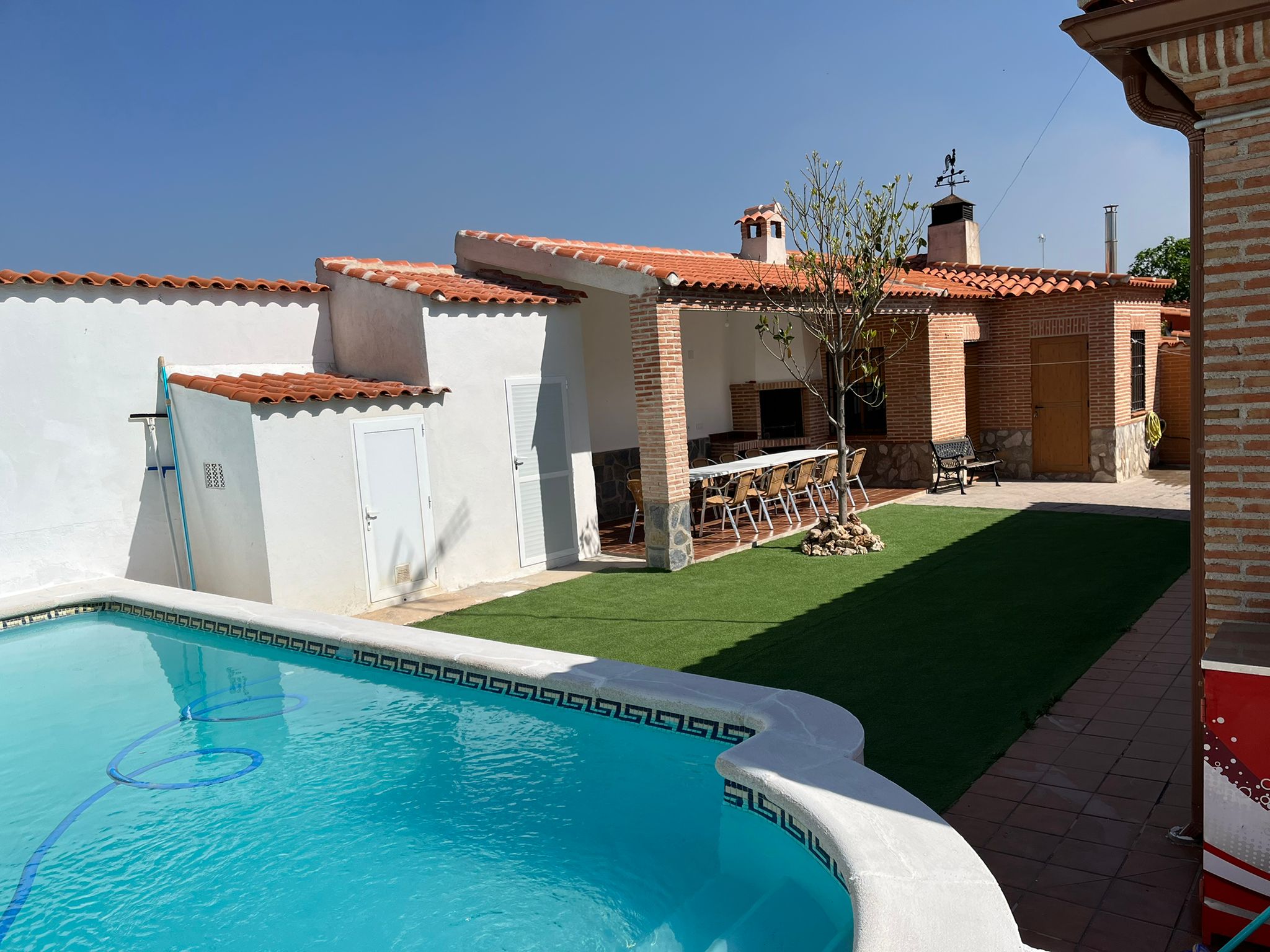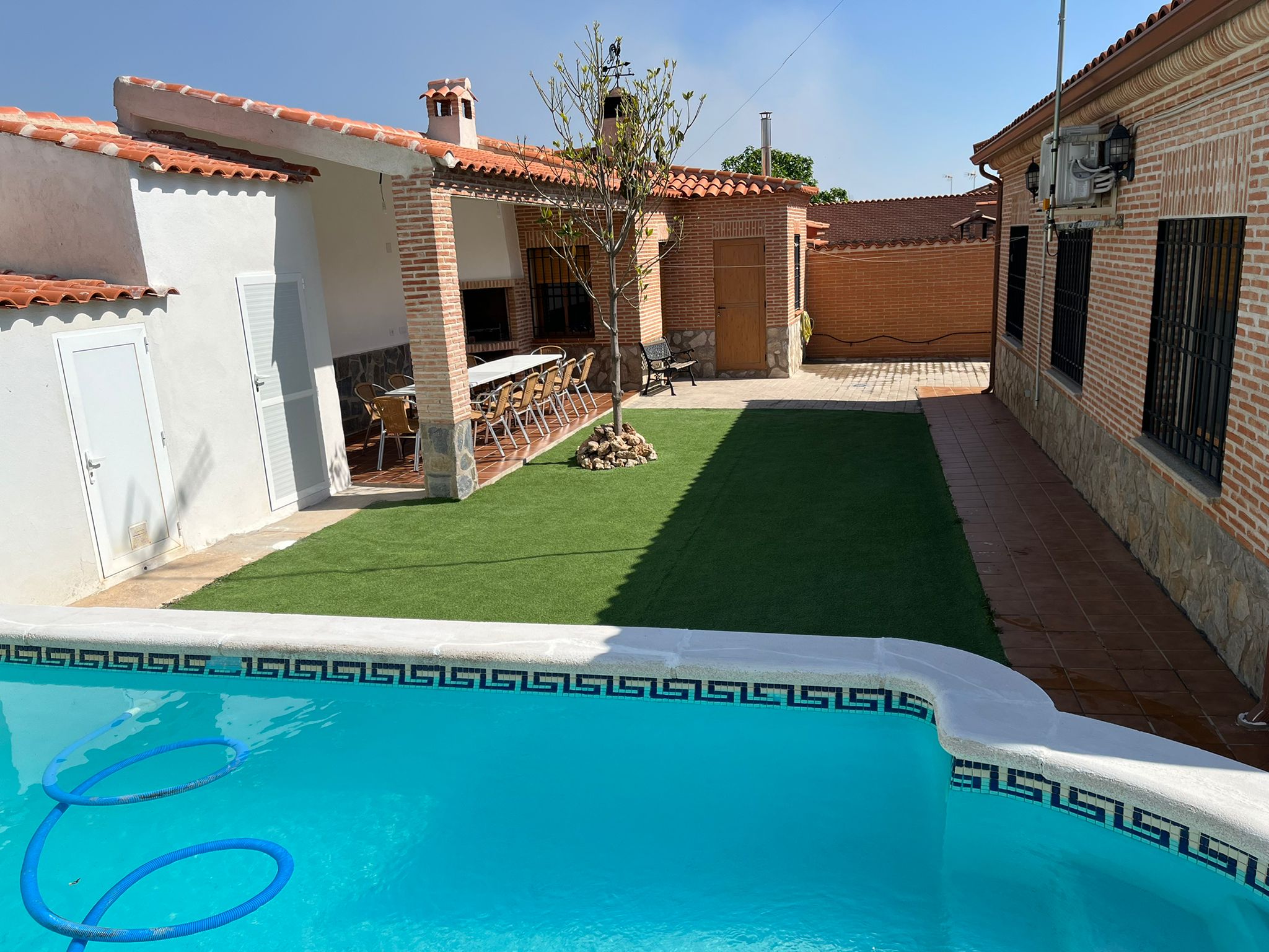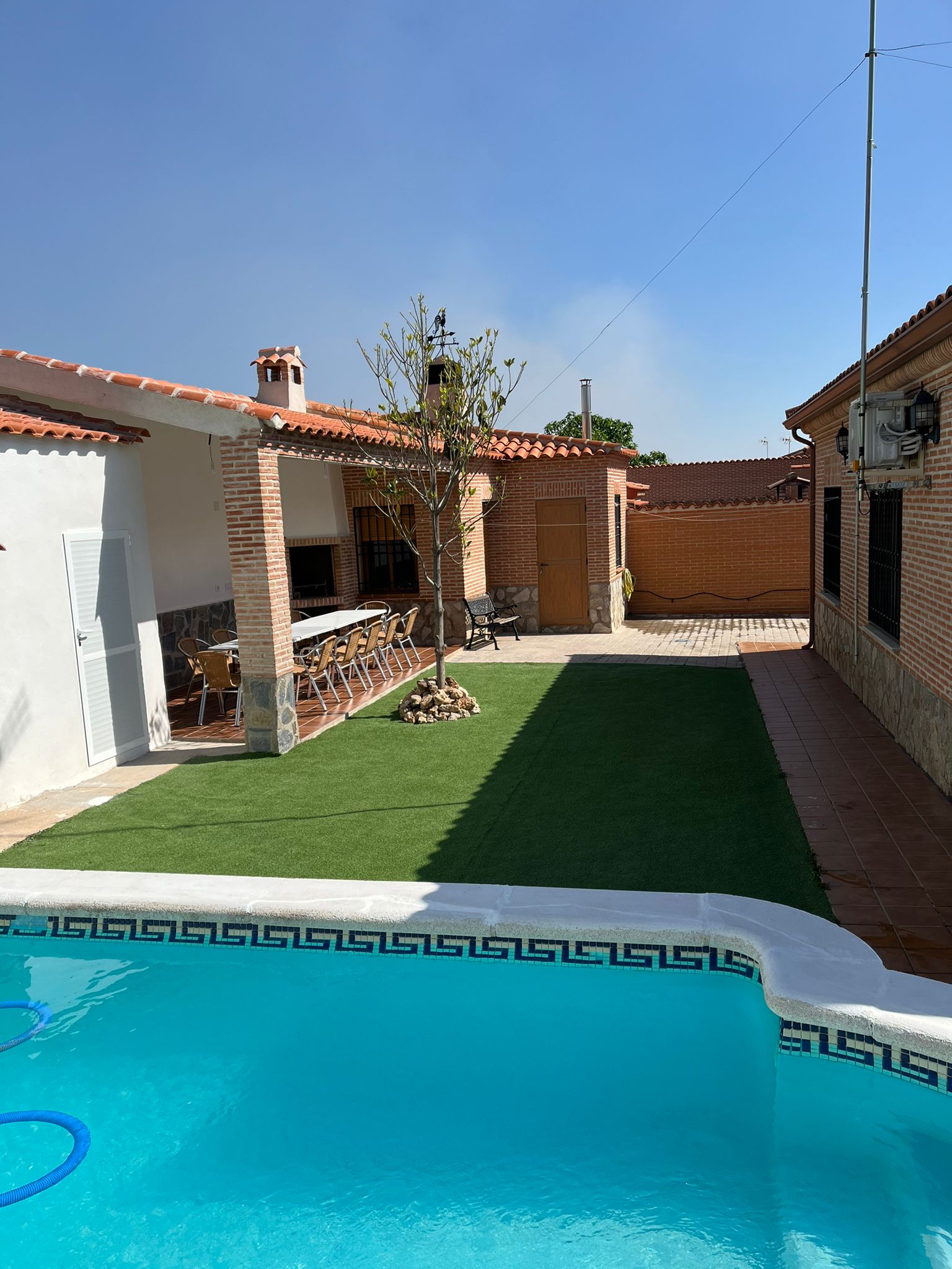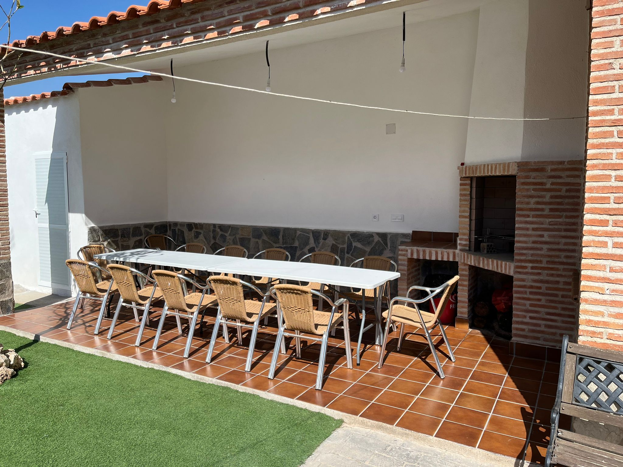 Disponemos de un gran Porche de entrada con jardín alrededor de toda la casa y mobiliario exterior, la piscina de verano con caseta independiente para depuradora, tumbonas y sombrillas además en esta zona se dispone de una segunda cocina exterior con chimenea en el patio, menaje de todo tipo incluido aro de gas y paellera grande.