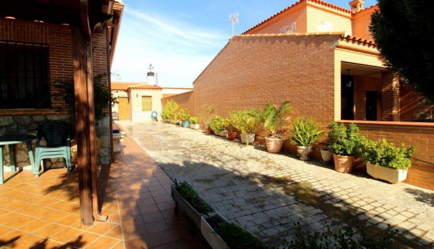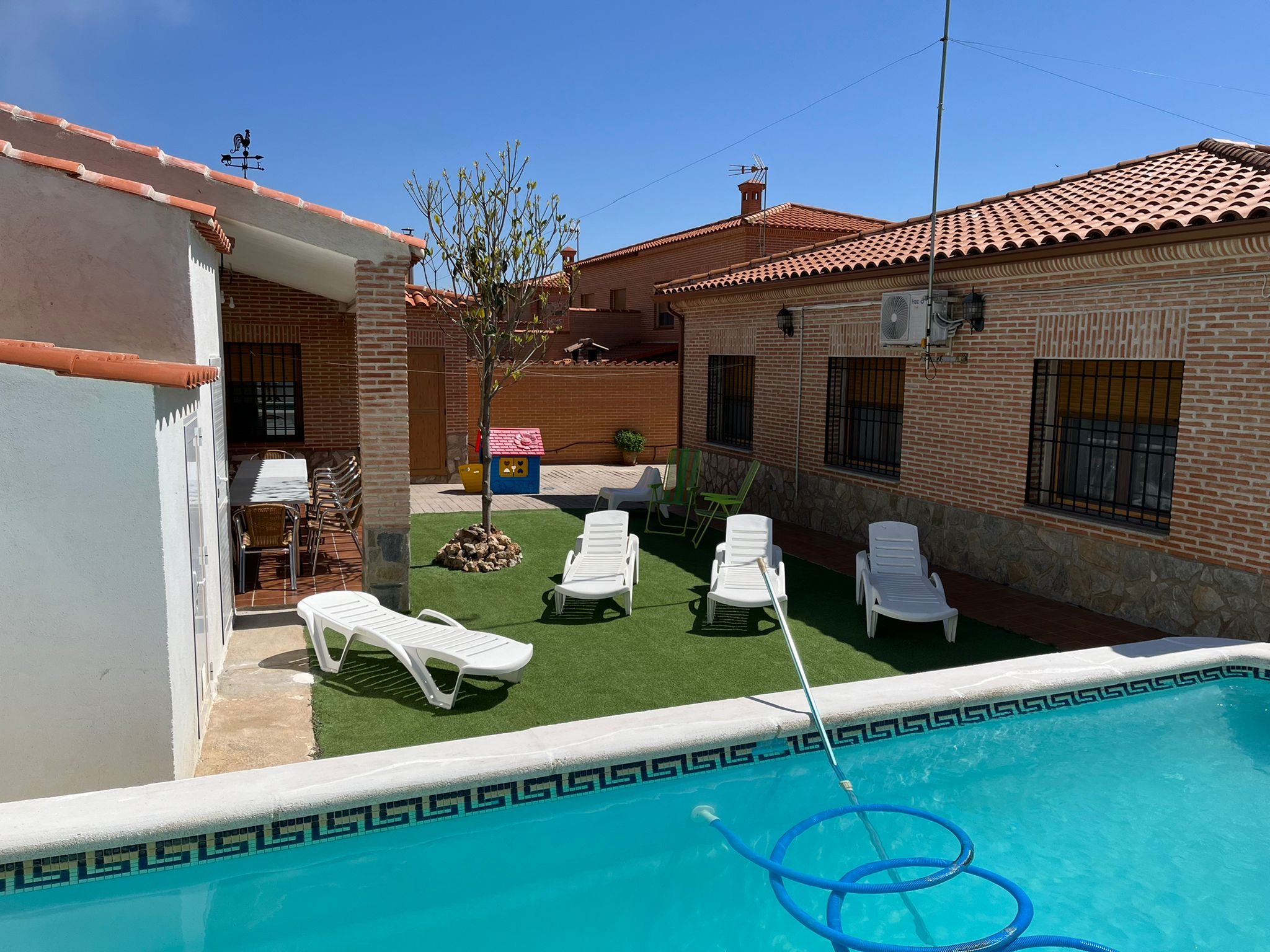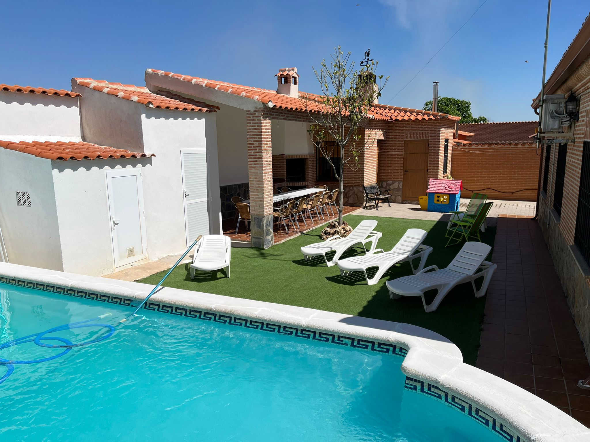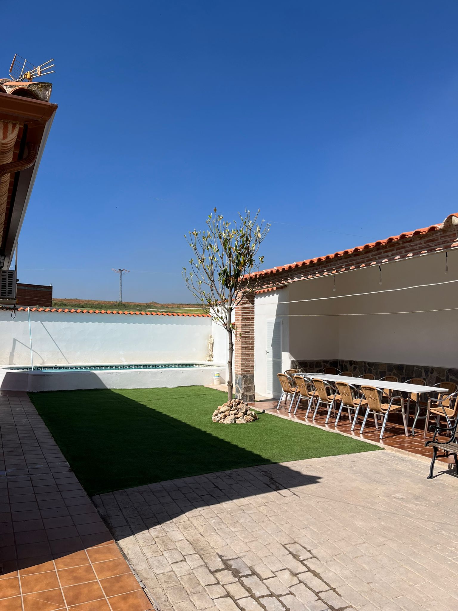 Disponemos de un gran Porche de entrada con jardín alrededor de toda la casa y mobiliario exterior, la piscina de verano con caseta independiente para depuradora, tumbonas y sombrillas además en esta zona se dispone de una segunda cocina exterior con chimenea en el patio, menaje de todo tipo incluido aro de gas y paellera grande.